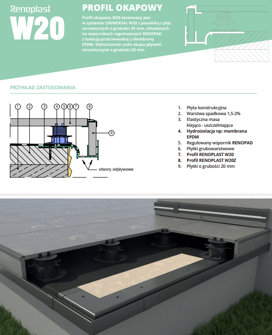 Profil W20 to innowacyjne rozwiązanie dla tarasów i balkonów z podniesioną posadzką (do 20 cm). Zapewnia skuteczne odwodnienie oraz estetyczne wykończenie czoła tarasu przy użyciu płyt ceramicznych, HPL lub z włókna cementowego.