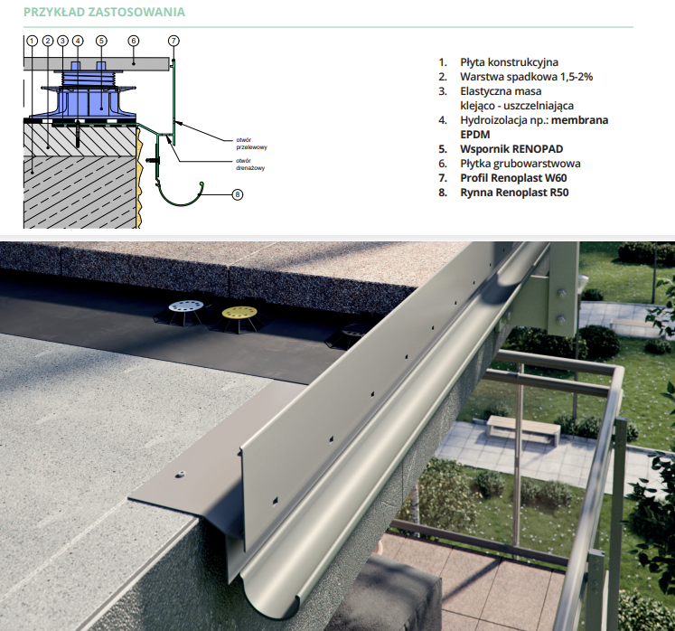 W60 to profil okapowy do wykończenia krawędzi tarasów z posadzkami z płyt o grubości 2cm lub desek kompozytowych układanych na legarach. Wykonany z aluminium pokrytego powłoką poliestrową. Stosowany w systemach z izolacją wykonaną z membrany EPDM, PVC lub szlamowej. Budowa profilu umożliwia systemowe zamocowanie rynny R50 lub RK65.