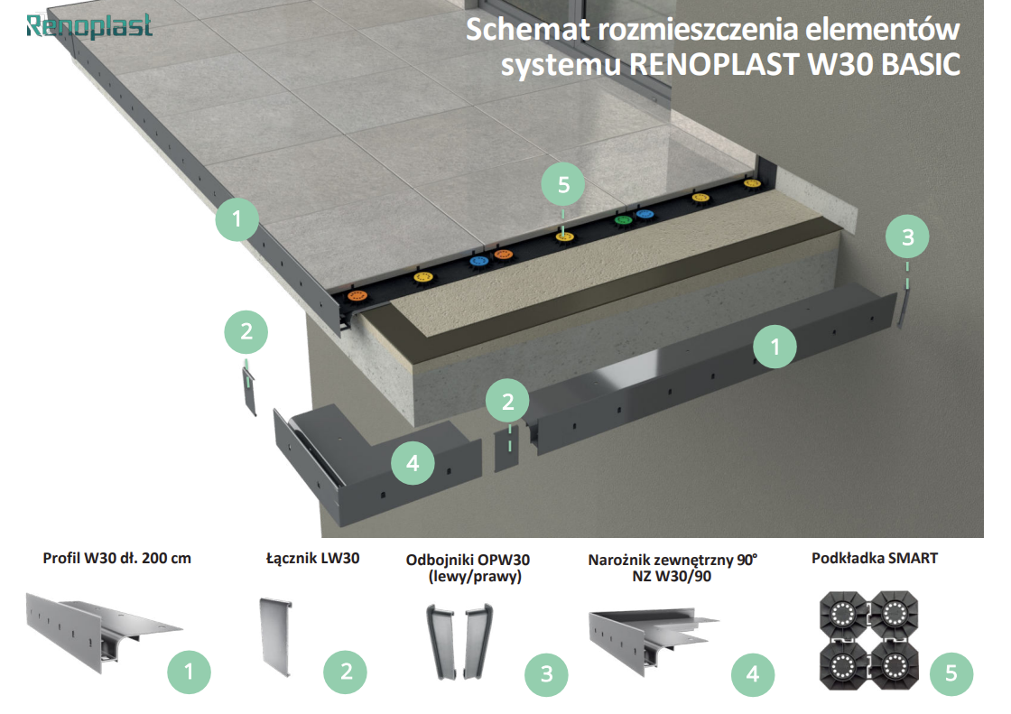 W30 jest profilem stosowanym na tarasach i balkonach z posadzką podniesioną – wentylowaną z płytek kamiennych, betonowych lub ceramicznych grubowarstwowych układanych na wspornikach. Profil okapowy W30 wykonany jest z wysokiej jakości aluminium, pokrytego powłoką poliestrową zapewniającą pełną odporność na korozję oraz zewnętrzne warunki atmosferyczne. Profile można łączyć z różnego rodzaju izolacjami takimi jak rolowe i powłokowe izolacje bitumiczne, membrany PVC i EPDM, żywice i mineralne zaprawy uszczelniające. Dzięki właściwej budowie profilu W30 zapewnione jest pewne oparcie i stabilizacja płytek posadzkowych wzdłuż krawędzi tarasu. Profil W30 posiada bardzo duże otwory odwadniające z unikalnym systemem dodatkowego odwodnienia izolacji poprzez otwory przelewowe w przypadku braku drożności podstawowych otworów odwadniających.