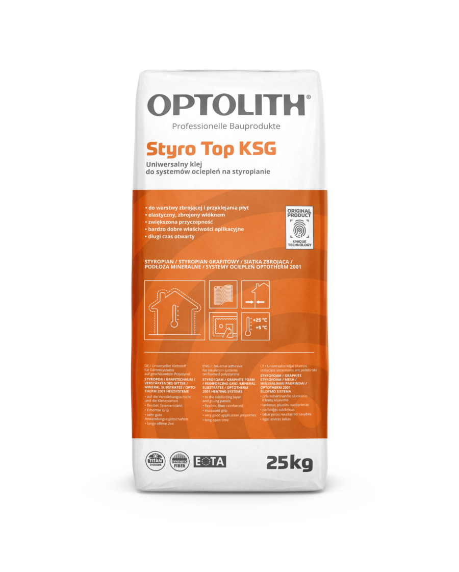 Optotherm StyroTop KSG przeznaczony jest do wykonywania warstwy zbrojonej i przyklejania izolacyjnych płyt ze styropianu (również grafitowego) w systemach ociepleń Optotherm. Wyrób, o cechach umożliwiających użycie na zewnątrz i wewnątrz pomieszczeń.