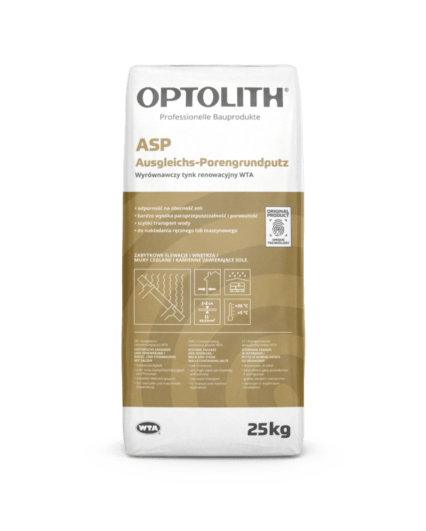 Optosan ASP jest wyprawą tynkarską w systemie tynków renowacyjnych WTA przeznaczonych na zawilgocone, zawierające szkodliwe związki soli budowlanych podłoża. Może być stosowany na zewnątrz i do wewnątrz. Stanowi warstwę wyrównawczą nakładaną przy większych grubościach tynku, lub wysokim stężeniu soli. Optosan ASP dzięki podwyższonej kapilarności stanowi także zaprawę wypełniającą spoiny w murze jako część przygotowania podłoża. Właściwa grubość tynku Optosan ASP i kolejność warstw w systemie jest uzależniona od stopnia i rodzaju soli zawartych w murze zgodnie z wytycznymi WTA.