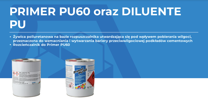 Primer PU60 jest jednoskładnikowym preparatem na bazie żywicy poliuretanowej, zawierającym rozpuszczalnik, który utwardza się za pomocą pobierania wilgoci występującej w otoczeniu i podkładzie.
