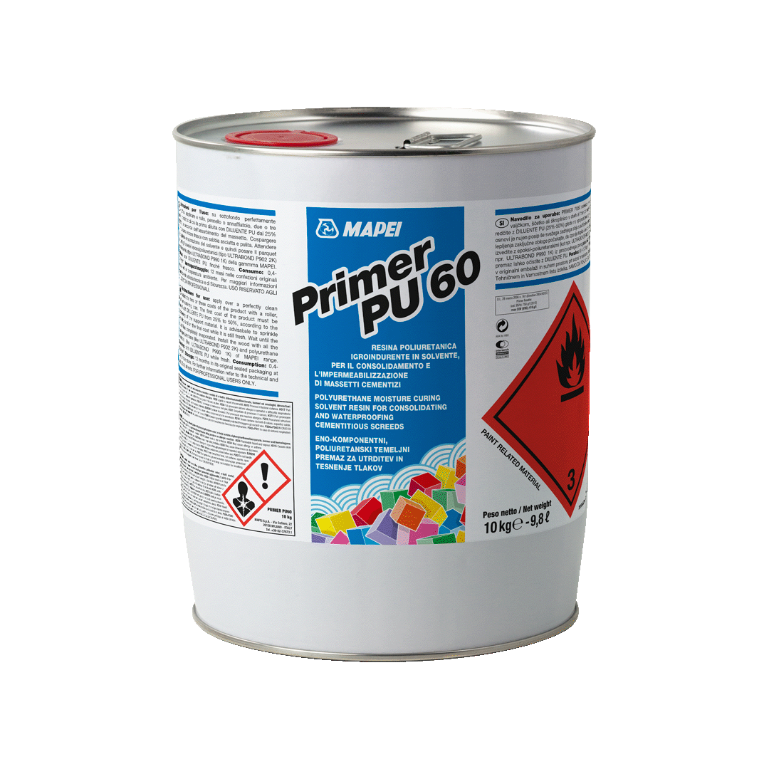 Podkład musi być czysty, pozbawiony jakichkolwiek zabrudzeń powierzchniowych, takich jak tynk, olej, wosk itp. oraz wysezonowany przez przynajmniej 7 do 10 dni na każdy centymetr grubości w przypadku podkładów tradycyjnych. Tam gdzie zastosowano szybkowiążące i szybkoschnące podkłady, czas sezonowania powinien być zgodny z zaleceniami dotyczącymi danego produktu. Szczeliny i spękania należy poszerzyć i zespolić preparatem Eporip lub Eporip Turbo. Należy nanieść przynajmniej dwie warstwy Primer PU60 przy użyciu wałka lub pędzla. Aby ułatwić penetrację pierwszej warstwy, rozcieńczyć produkt rozcieńczalnikiem Diluente PU od 25% do 50% w zależności od chłonności podłoża. Po 4 godzinach nałożyć drugą warstwę produktu, stosując tę samą proporcję rozcieńczenia. Jeśli utworzona powłoka nie jest jednolita, można nałożyć kolejną warstwę nierozcieńczonego produktu, gdy tylko po poprzedniej można będzie chodzić (w każdym razie nie więcej niż po 18 godzinach). Przed przejściem do następnego etapu prac należy odczekać, aż rozpuszczalnik całkowicie odparuje, co zwykle zajmuje od 2 do 7 dni. W celu zapewnienia dobrej przyczepności kleju lub zaprawy wyrównującej, zaleca się posypanie czystym, suchym piaskiem ostatniej warstwy, gdy jest jeszcze świeża (zasypać natychmiast po nałożeniu ostatniej warstwy).