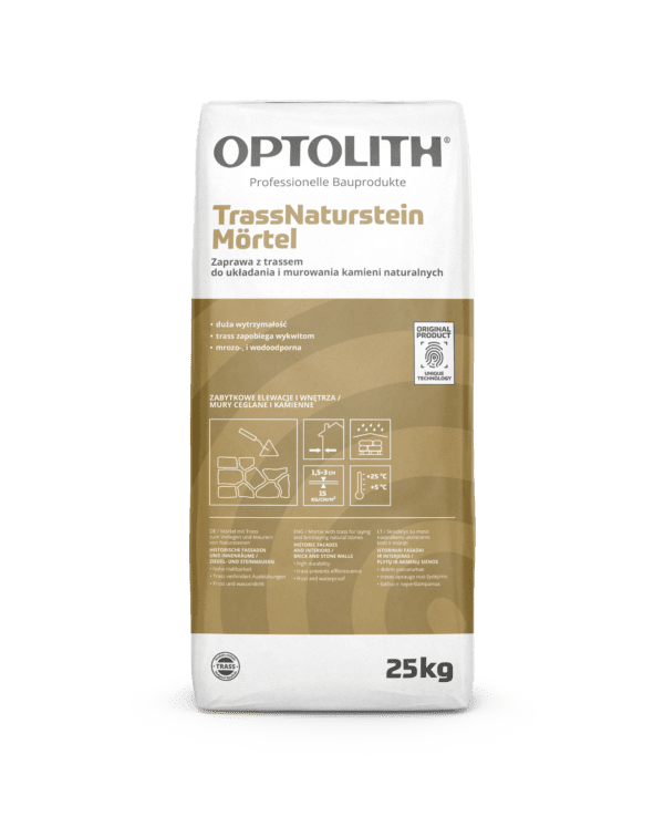 Optosan TrassNaturstein Mӧrtel jest suchą fabryczną zaprawą wyprodukowaną na bazie spoiw wiążących hydraulicznie wg PN-EN 197-1:2012, reńskiego trassu, frakcjonowanych kruszyw 0-4 mm wg EN 13139:2003 oraz specjalnych dodatków poprawiających własności użytkowe produktu zgodnie z przeznaczeniem. Niska zawartość chromianów TRGS 613.