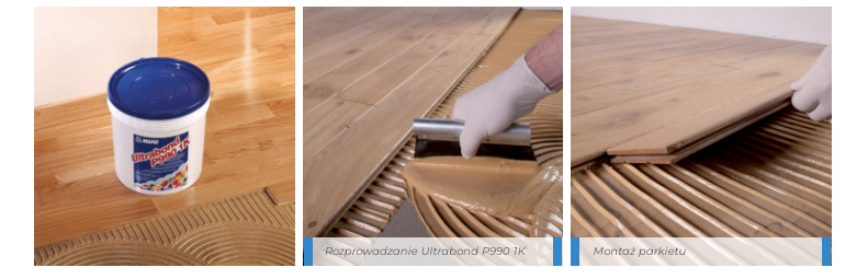 Parkiet powinien być składowany w pomieszczeniach suchych, zabezpieczonych przed wpływem zmian temperatury i wilgotności, ułożony na odpowiednich stelażach izolujących je od podłoża. Przed przystąpieniem do klejenia należy sprawdzić, czy wilgotność drewna jest zgodna z wymaganiami producenta i z wilgotnością otoczenia. Podczas montażu każdy element drewna należy dobrze przycisnąć do podłoża tak, aby nastąpiło równomierne wypełnienie jego spodniej powierzchni klejem. Specjalne właściwości Ultrabond P990 1K pozwalają na łatwe korygowanie montowanych elementów. Na całym obwodzie układanego parkietu, przy wszystkich ścianach, a także dookoła słupów i innych wystających elementów należy pozostawić ok. 1 cm wolnego miejsca (dylatacja brzegowa). Nie rozprowadzać kleju aż do samej ściany i nie ma konieczności, aby klej był rozprowadzony aż do linii końcowej zasięgu układanych elementów drewnianych. W przypadku tradycyjnego parkietu należy się upewnić, że po dociśnięciu elementów drewnianych klej nie wypływa spod parkietu. Nie należy bowiem pozostawiać śladów kleju na posadzce, aby uniknąć zmian koloru w złączach lub powstania smug na posadzce.
