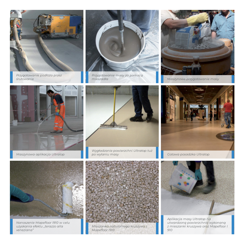 Masę Ultratop rozkłada się ręcznie lub przy użyciu środków mechanicznych (maszyna do tynków z pompą ślimakową) w pojedynczej warstwie o grubości od 5 do 40 mm przy pozostawieniu surowej, gładkiej powierzchni lub 10 do 40 mm przy późniejszym szlifowaniu. Należy przestrzegać ciągłości wylewania i podawania mieszanki dla uniknięcia zróżnicowania w gładkości i kolorystyce posadzki. Dzięki swoim właściwościom samopoziomującym mieszanka Ultratop nie pozostawia nierówności po zagładzaniu. Przy układaniu posadzek z materiału Ultratop należy przestrzegać odpowiednich powierzchni pól dylatacyjnych ok. 50 m . W przypadku ogrzewania podłogowego powierzchnia ta powinna być zmniejszona do 25-30 m . Powierzchnia posadzek wykonanych z masy Ultratop może pozostać niewykończona lub może być szlifowana, jeżeli takie wykończenie jest wymagane. Jeśli Ultratop został zastosowany w obiektach przemysłowych (apartamenty, sklepy, itp.), gdzie rozmiar pomieszczeń jest mniejszy niż 50 m², należy wykonać dylatacje w pobliżu progów drzwi i wszędzie tam gdzie istnieją znaczne różnice w metrażu pomieszczeń, w których będzie układana posadzka. Uszczelnić spoiny preparatem Mapeflex PU45 FT szybkotwardniejącym uszczelniaczem, nadającym się do malowania, o wysokim module sprężystości aż do 20%, przeznaczonym do uszczelniania dylatacji i złączy kompensacyjnych. Aby dopasować głębokość i uniemożliwić przyleganie Mapeflex PU45 FT do dna dylatacji, należy wstawić do środka szczeliny Mapefoam, sznur z pianki polietylenowej o strukturze zamkniętych komórek. Posadzkę wykonaną z Ultratop można pozostawić bez szlifowania lub zeszlifować uzyskując tym samym określony efekt estetyczny. W pierwszym przypadku, po około 3 dniach po naniesieniu, powierzchnia posadzki Ultratop musi zostać zabezpieczona preparatami hydrofobowym z linii Mapefloor Finish. Wybór warstwy zamykającej zależy od żądanego efektu estetycznego i wymaganej odporności. W przypadku pytań należy się skonsultować z Działem Technicznym MAPEI. W przypadku powierzchni polerowanej, warstwę ochronną należy wykonać z zastosowaniem Mapecrete Stain Protection. Jako alternatywę dla Mapecrete Stain Protection można zastosować Mapecrete U-Protector, który tworzy na powierzchni mikrofilm, nadający powierzchni wysoką ochronę przed plamami i wodoodporność. Pod koniec należy nałożyć jedną warstwę wosku metalizującego Mapelux Lucida lub Mapelux Opaca, aby ułatwić czyszczenie i konserwację posadzki. Szlifowanie