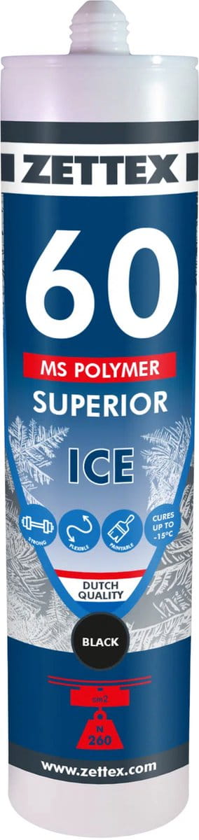 Zettex MS 60 Polymer Superior ICE to wysokiej jakości klej i masa uszczelniająca do konstrukcji, która dzięki unikalnemu składowi może być stosowana nawet w niskich temperaturach. Produkt utwardza się w temperaturach do -15°C i doskonale przywiera do materiałów takich jak poliester, PU, stal nierdzewna, drewno, aluminium, niektóre gatunki ABS (zalecane testy) itp. Można go również nakładać na wilgotne powierzchnie.