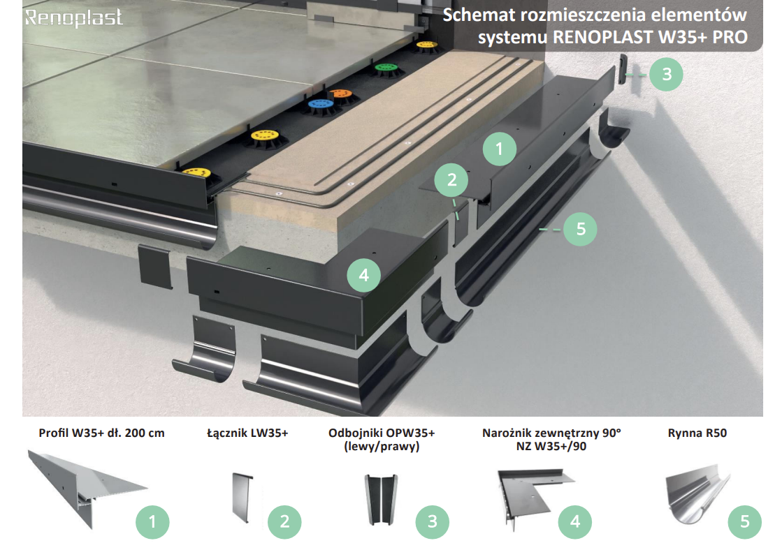 W35+ to profil okapowy do wykończenia krawędzi balkonów i tarasów z posadzkami z płyt grubowarstwowych układanych na wspornikach SMART. Profil został wykonany z aluminium pokrytego powłoką poliestrową, dzięki czemu posiada pełną ochronę przed korozją. Budowa profilu umożliwia jego szczelne połączenie z hydroizolacją poprzez taśmę Clever (hydroizolacja w postaci zaprawy), kołnierz PVC (hydroizolacja w postaci membrany PVC) lub kołnierz EPDM (membrana EPDM) . Usytuowane wzdłuż „noska” otwory, odprowadzają wodę na zewnątrz płyty. Do profilu (wersja prosta) pasuje aluminiowa rynna R50 oraz RK65 dostępna w naszym asortymencie.