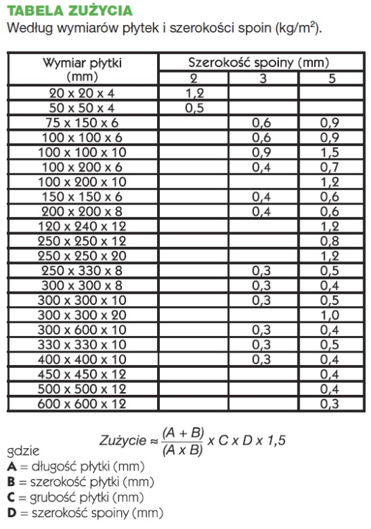 - Zużycie: zależy od szerokości spoiny oraz od formatu i grubości użytych płytek.