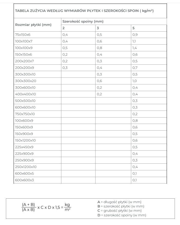 Zużycie Ultracolor Plus zmienia się w zależności od rozmiarów spoiny oraz formatu i grubości płytki. W tabeli podano niektóre przykłady zużycia w kg/m .