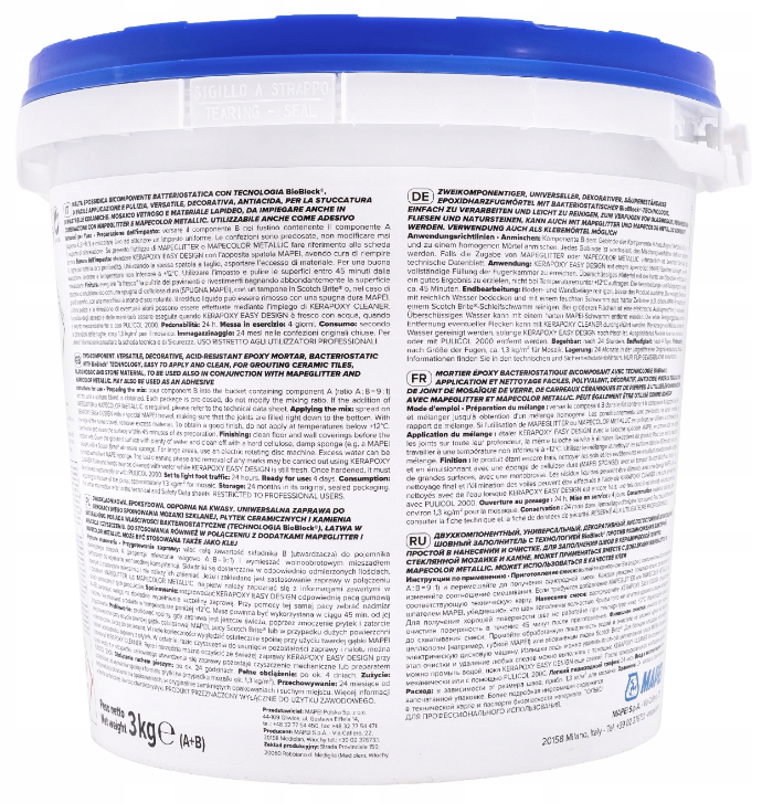 - Układanie i spoinowanie okładzin dekoracyjnych w pomieszczeniach o szczególnej wartości estetycznej (np. show-roomy, pomieszczenia handlowe itp.). KERAPOXY EASY DESIGN Dwuskładnikowa, uniwersalna, dekoracyjna, kwasoodporna fuga epoksydowa z dodatkiem środka bakteriostatycznego oraz z technologią BioBlock . Łatwa w aplikacji i czyszczeniu. Idealna do płytek ceramicznych, mozaiki szklanej i materiałów kamiennych, może być również stosowana w połączeniu z MapeGlitter i Mapecolor Metallic. Szerokość spoin od 1 do 15mm. Może być stosowana również jako klej®