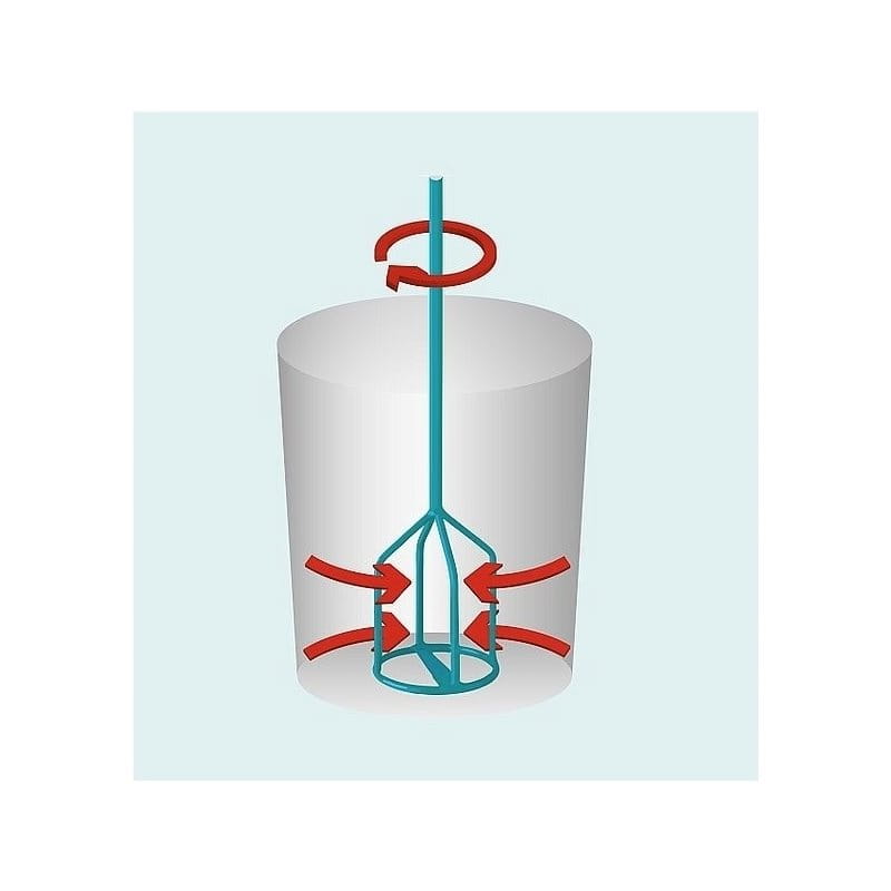 Mieszadło KR wytwarza duże siły ścinające, które zapobiegają tworzeniu się grudek i zapewniają szybkie, jednolite zmieszanie masy. Poprzeczka pomaga zeskrobać materiał z dna wanny. Łatwe do czyszczenia (materiał prawie nie klei się do narzędzia).